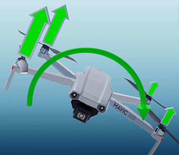 To summarize, if we want the quadcopter to rotate say clockwise, the fans spinning counterclockwise should be faster. Only then can Newton’s third law come into action and spin the quadcopter in the opposite direction, clockwise. Motion Benefit #3: We can go forward, backward, and also sideways without any trouble. Let’s say we want the quadcopter to move to its left. The quadcopter is facing us in the image below, so our right is its left.